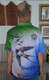 Simon - Full customised print front and back with swallows overlayed on the Mijas flag colours. Swifts- Pairs League Team shirts.